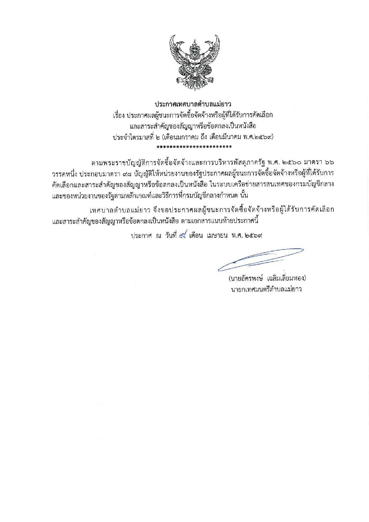 ประกาศผู้ชนะการจัดซื้อจัดจ้างหรือผู้ได้รับการคัดเลือก ตามพรบ.จัดซื้อจัดจ้างฯ2560 มาตรา 66 ประจำไตรมาสที่ 2 (เดือนมกราคมถึง เดือนมีนาคม 2569)